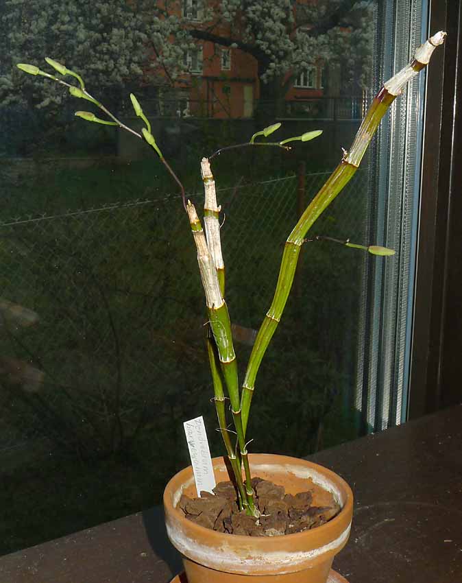 Z Drážďan jsem si přivezl ještě jedno Dendrobium harveyanum, protože se mi tento druh velmi líbí. Bylo pouze zabalené do celofánu s bohatou násadou poupat a zcela bez listů. Některé květní stvoly odešly při transportu v tašce, ale ještě dost zůstalo. Překvapilo mě jak někomu může zcela opadat, protože já mám s opadem listů všeobecné problémy. Teď se těším až rozkvete. Ten kontrast holých klacků a nádherných květů bude zajímavý. Doufám, že se mi něco podobného povede v budoucnu u velkých trsů