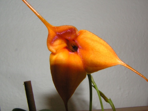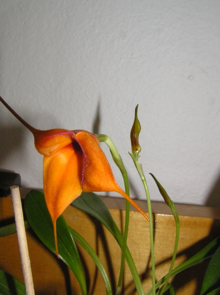 Tak na stanhopeu tigrinu si zatím musím nechat zajít chuť, ale mám radost, masdevalie, co jsem si ji přivezle z Budějic prospívá, nasazuje jeden list za druhým a rozkvetla, zatím 1 květ a v pořadí jsou další 3. Na tak malého "prcka" celkem dost.Tak možná zkusím pořídit ještě nějakou.