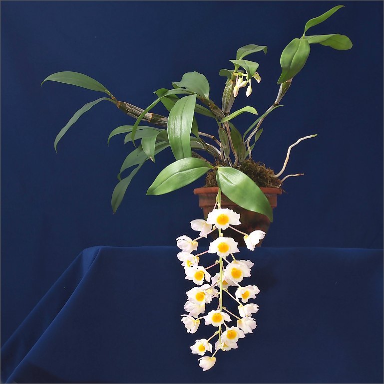 V mém případě byl trochu problém slušně vyfotit habitus D. farmeri- jedná se o poměrně vzrůstnou orchidej,ale - a to je podstatné - květy visí dolů hluboto pod základnu květináče.Fotil jsem ji ve fotostanu,první fotografie je bez úprav,druhá po ořezu a drobných úpravách, a třetí je s vyretušovanou podložkou.