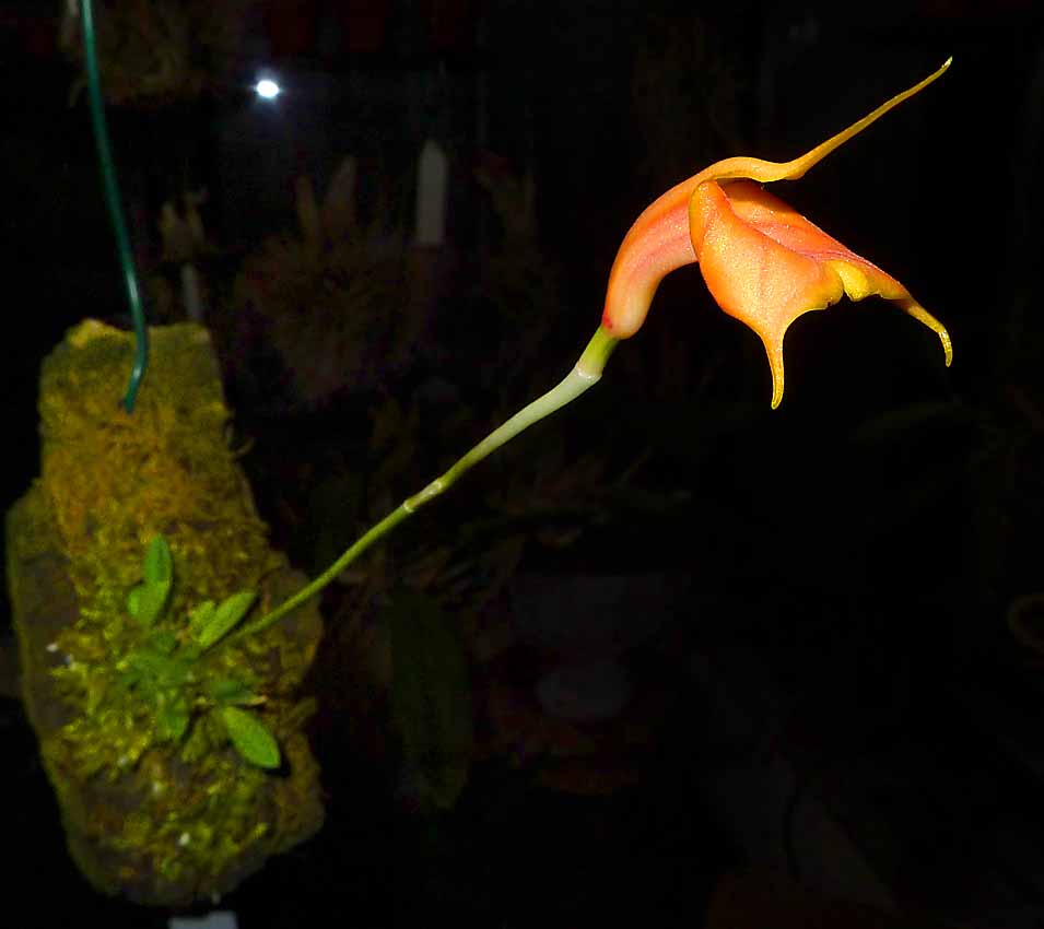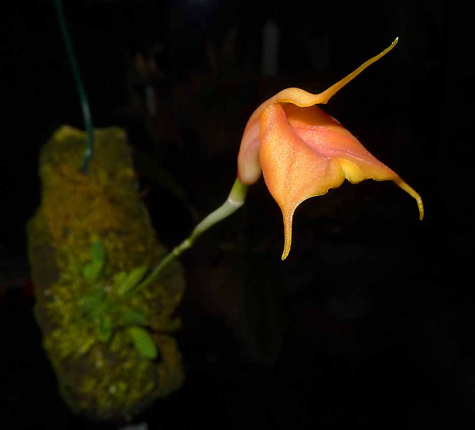 Masdevallia amabilis. Importík se již zabydlel a docela se snaží. Loni kvetl dvakrát. Květ v poměru k tělu je obrovský. Je to asi nějaká miniatura neboť lístky mají tak 2cm délku.