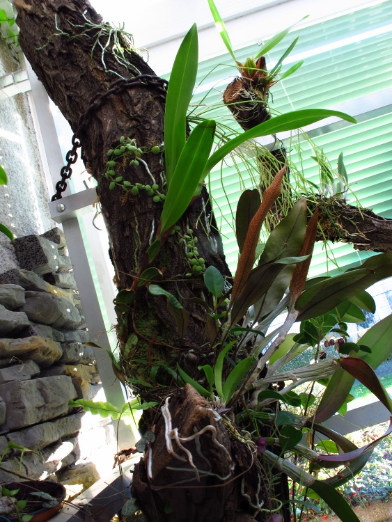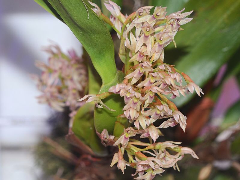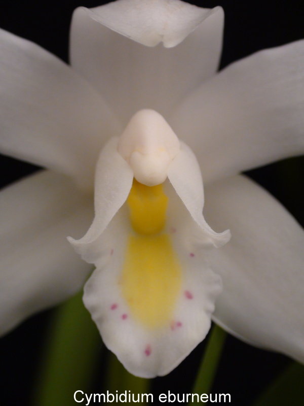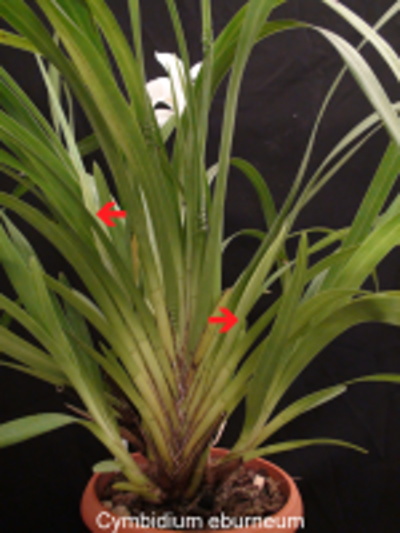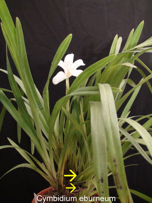 Cymbidium eburneum.První květ na tříleté rostlině od Orchids and More.Zajímavé,že se květní výhony objevily i na dvouletém výhonu,nedotáhly to do konce,zaschly.Označeno žlutými šipkami.Na výhonu z r.2014,označeno červenými šipkami jsou ještě dva květní výhony které to snad(!) dotáhnou úspěšně do konce.Květ jemně voní.Květ je sněhobílý.
