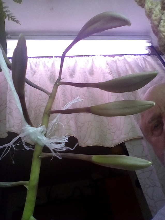 Cattleya lawrenceana Canaima bude mít 8 květů. A to na ni nedávno dozrál semeník a před rokem jsem ji rozdělil a přesadil. Mizerná fotka a pozadí, jako obvykle, ale vidět to je.