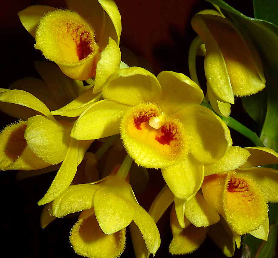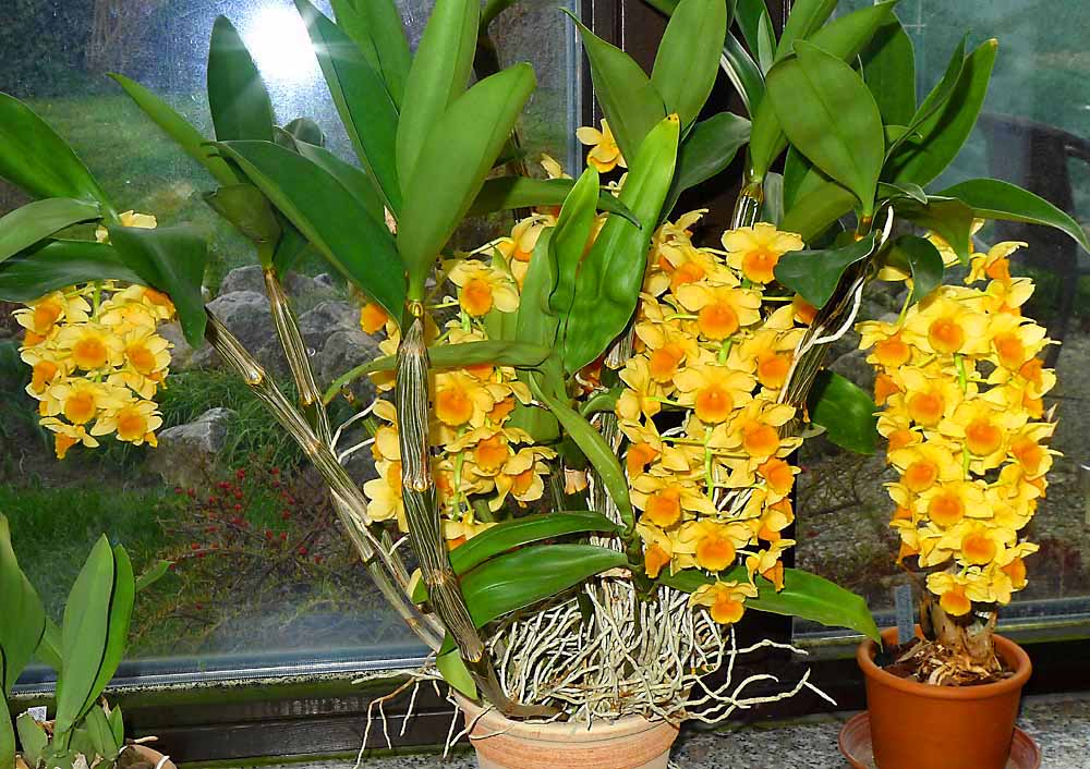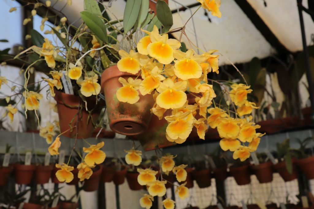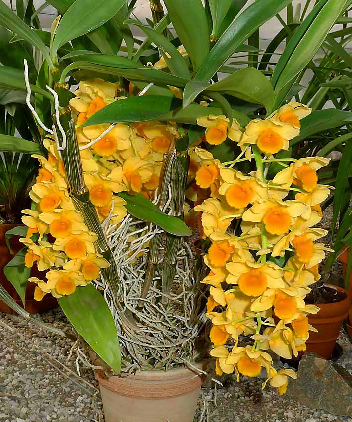 Rozkvetlo žluté Dendrobium densiflorum. Chladná perioda tomuto druhu dělá dobře.