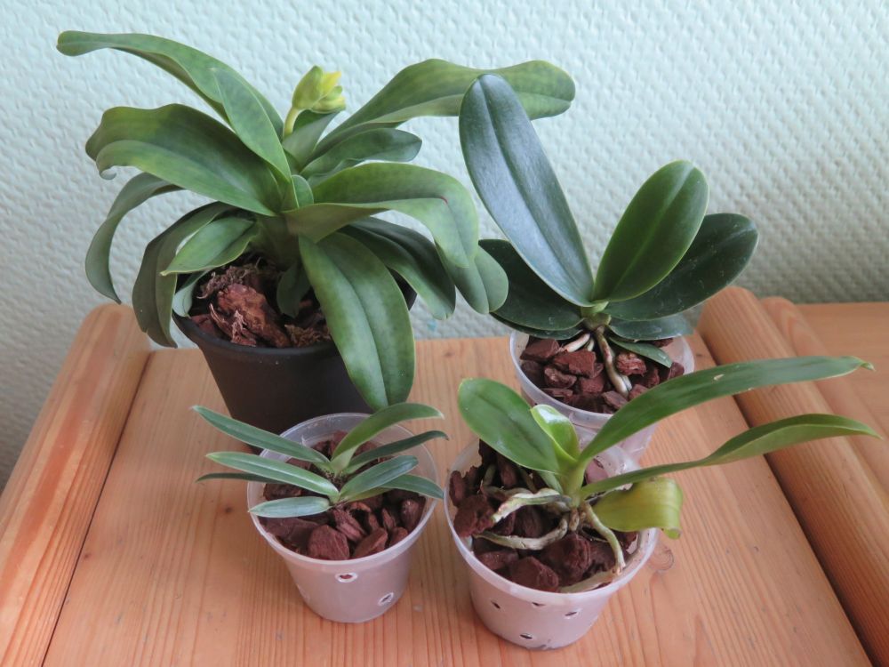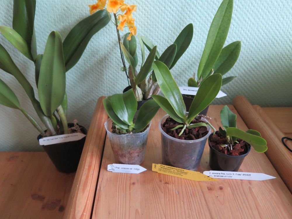 Drážďany: Úplně vlevo darovaná "nestvůra" - obrovskokvětá hybridní žlutá cattleya. Žádnou takovouhle velkou obludu nemám, jsem si vědoma jejich nedostatků (kvete jen 1x ročně, květ vydrží krátce), ale prostě se mi moc líbila. Vzadu d.aggregatum a oncidium lanceanum. Vpředu zleva: phal. violacea indigo, phal. lueddemanniana - všechny 4 jsem si moc přála, některé už dlouho. A úplně vpravo primární hybrid, na který jsem prostě zvědavá - c.dowiana rosita x c.tenebrosa. A jsem ráda, že jsem aspoň na chvíli, i když jen některé z vás, viděla. Martina