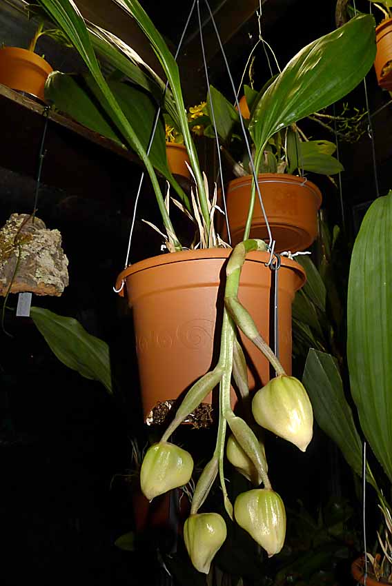Měla by to být Stanhopea wardii. Tak snad p. Elsner poslala to pravé  . Stvol sice vyrostl horem ale v kvetení mu to nezabránilo. Ani nevím jestli a případně jak bude vonět.