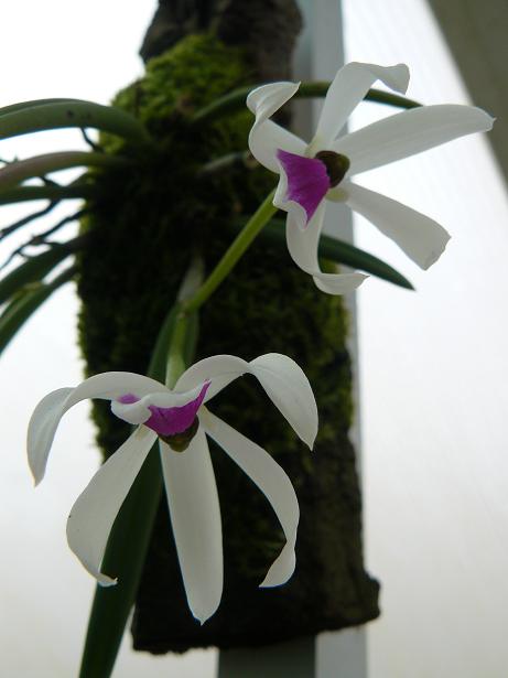 Přidám taky jednu z drobnějších orchidejí - Leptotes bicolor. Rostlina vytváří převisle rostoucí výhony a květy jsou otočené o 180 stupňů. Vypadá velmi zdobně a všechny druhy tohoto malého rodu jsou vhodné k umístění do vitrín.