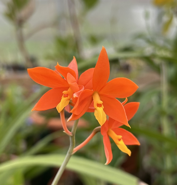 Prosthechea vitellina. Přišla s přídomkem 'Sundown Magic', ale nikde jsem takový klon nenašel. Malá kytka, zatím 4 květy na klasu, mám ji tři roky a ještě ji moc neumím, takže sílí pomalu. A můj oblíbenec, přivezený před mnoha lety od Lukscheitera - kvete spolehlivě každý rok, krásně voní, což bohužel neocením  . T.
