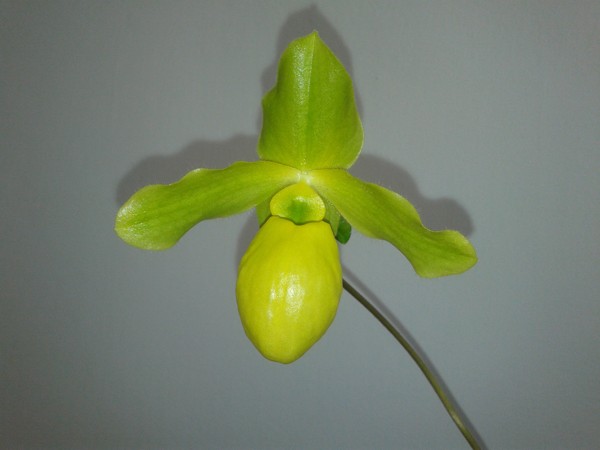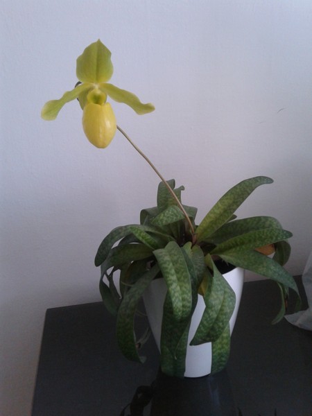A já se mohu konečně také pochlubit krásným střevíčníkem :-) Barva více odpovídá fotce detailu, krásně žlutá. Bohužel na štítku není přesný název...možná jde o Paph. Gold Dollar možná Envy Green...