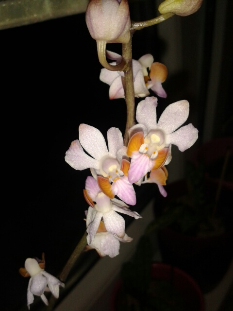 Ahojky. Vykvetla mi Doritis pulcherima...kupovana u pokojovek jako uplne jina forma ale vykvetlo toto...slabe ruzova s oranzovou, pokojovky ji maji v nabidce jako varietu minor, na netu ale moc zdroju tuto varietu neudava. Nevite nekdo vice o teto variete?
