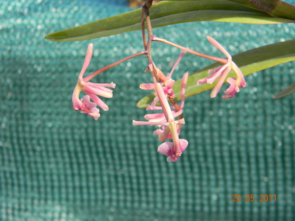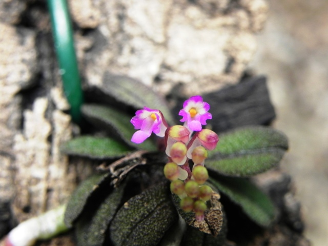 Rozkvétá Schoenorchis pachyacris, mám tři rostlinky od ledna, dvě pokvetou, z toho jedna na dvou stvolech, navázaná na holém korku, velikost květů asi jako hlavička barevného špendlíku, celá rostlinka asi jako dvacetikoruna. Je ve vitríně. Kdybych ji nevyfotila ani bych nevěděla jak vypadá, až rozkvete celá dám sem ještě fotku.