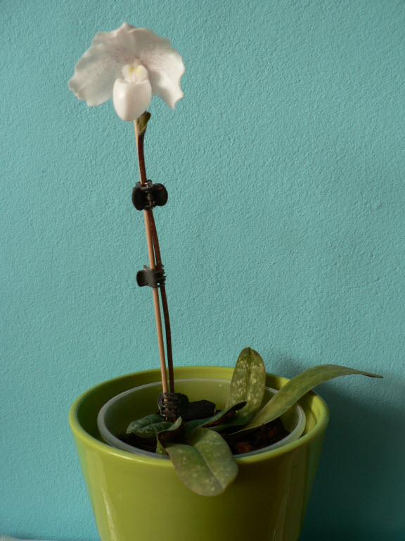 Ne moc vydarene fotky meho prvniho vydareneho kveteni "botaniky". Paphiopedilum niveum.