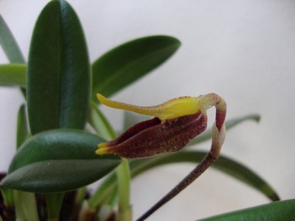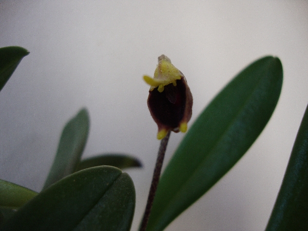 Rozkvetla Masdevalia pyxis, slabě smrdí.