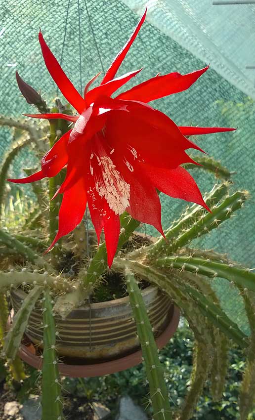 Dnes mi rozkvetl první květ na Heliocereus speciosus. Pochází z Mex. ze státu Michoacan. Je to čistá botanika. Lokalita je 2300m.n.m. Snáší teplotu do 0°C. Květy se na slunci lesknou-opalizují. Letos to vypadá že pokvete docela bohatě. Také Vanda "Blue Magic" něco vystrčila.