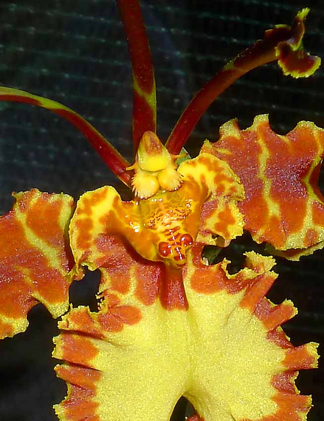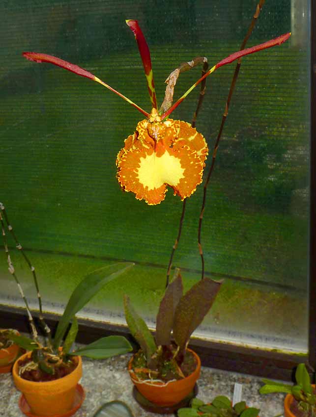 Nyní mi rozkvetl Psychopsis papilio. Je koupený od p. Willingera z ČB. Dušoval se, že to je na 100% papilio protože mu kvetl a koukal na květ. Já s ním ale bohužel nemám dobrou zkušenost, ale nakonec mne přesvědčil a kytku jsem koupil. Známý mi říkal, že papilio se pozná podle toho, že má uvnitř květu dva samostatné "fousy" s hlavičkou, každý na jinou stranu. Nyní když vykvetl tak opravdu ty "fousy" takové má. Nevím ale, jestli to stačí jako určovací znak. Rostlina má zelené listy bez kresby. Líbí se mi a má trochu jiný květ než ten můj druhý Psychouš který měl býti také papilio. Nakonec ale měl "fousů" hodně a listy s kresbou, tak nevím jestli to není ten werstegeana.