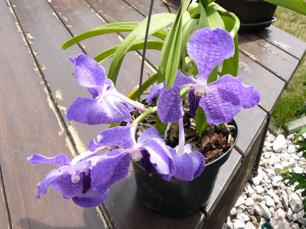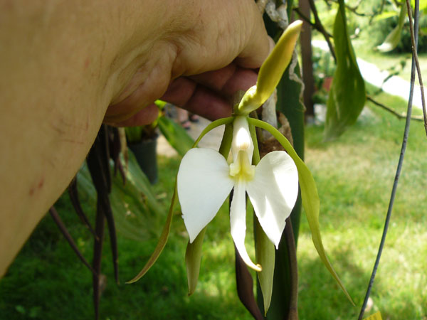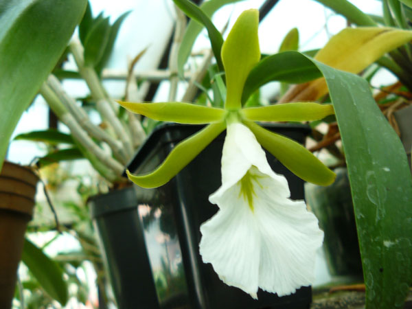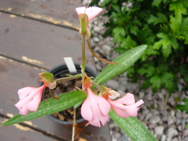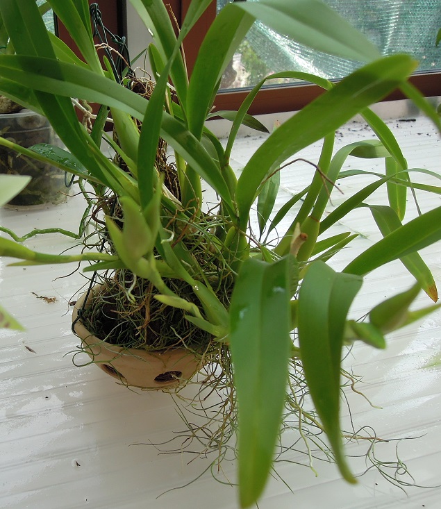 Prodejcem v Homolích blíže neurčená Miltonia, koupená vyvázaná, posléze vpravená i s kůrou do díraté misky. 4 květní výhony. Asi odolný hybrid, protože clowesii jsem brilantně umořila.