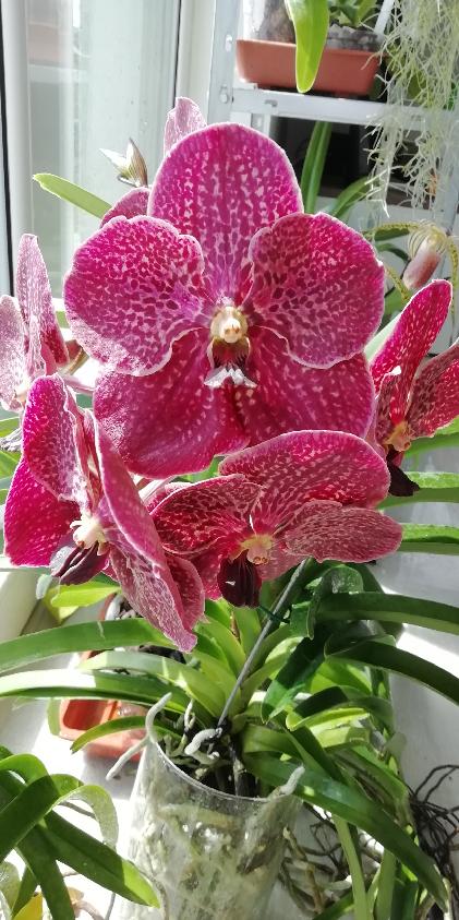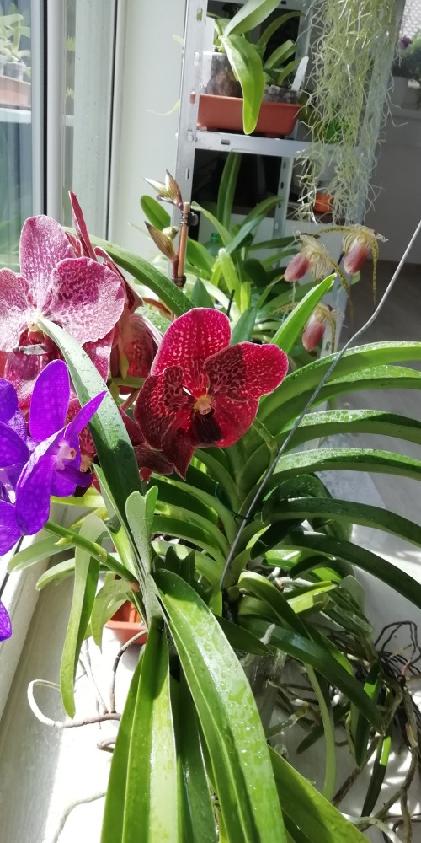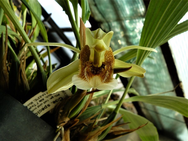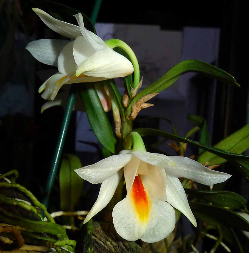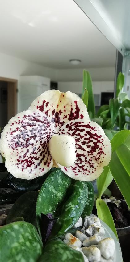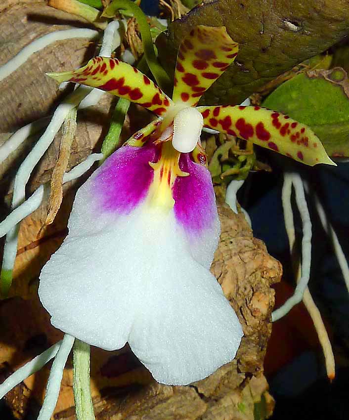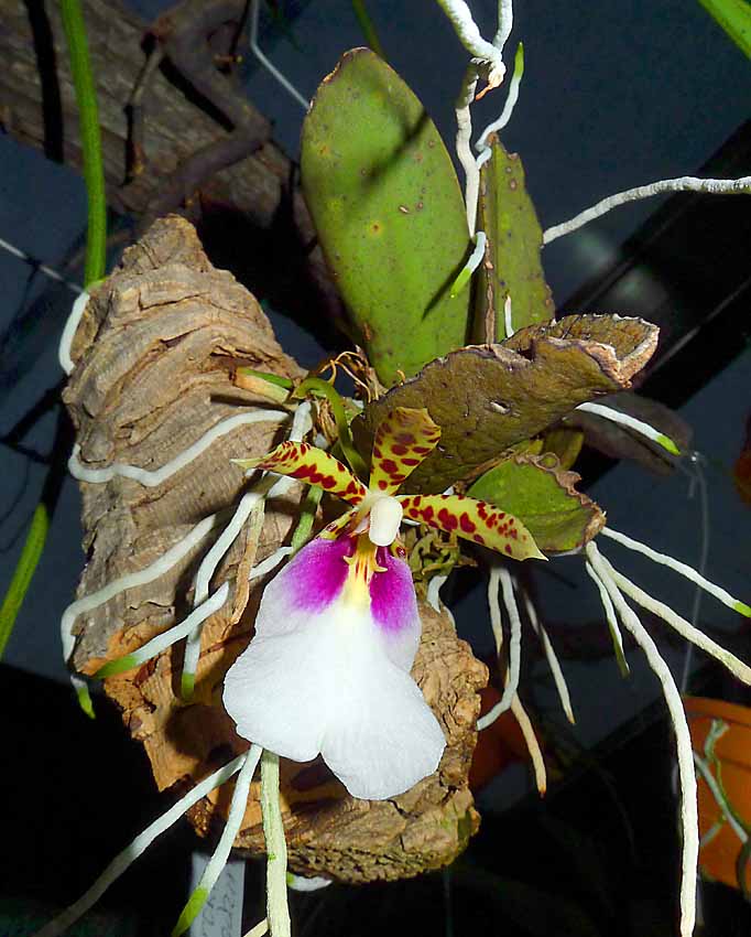 Rozkvetlo Trichocentrum tigrinum. Rostlina je náročná na cirkulaci vzduchu. Po sprchování musí rychle oschnout jinak hrozí hniloba poupat případně celé rostliny.