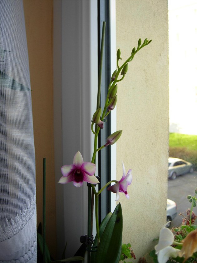 Ahoj přátelé, kamarádi (to je z té radosti  ). Vkládám sem svůj úplně první vlastní (snad jej tak můžu nazvat, když ho mám cca půl roku) výpěstek-můj první květní stvol. I když je to "jen" hybridní Dendrophal., pro mě je ten nejkrásnější na světě  . Koupila jsem ho ve výprodeji téměř odkvetlý-měl poslední 3 kvítka a než začal rašit tento stvolík, uběhli asi 4 měsíce. Začínají mi rašit ještě 3ks Phalíků a jedna Cambrie, ale toto je opravdu první rozkvetlá vlaštovka a mám velkou radost, že se jim u mě snad líbí  . Já vím, pro většinu z vás to nebude vůbec zajímavé a nudné, hybridy a ještě takové, ale buďte prosím tolerantní ke štěstí začínajícího šílenství  .