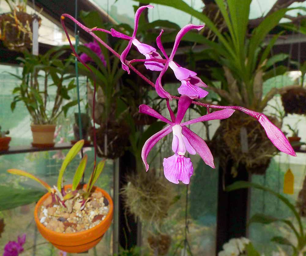 Dnes jsem se byl podívat u Aleše Dvořáka na Prodejním dni otevřených dveří. Koupil jsem si Encyclia moebusii Je to malá rupicola z Kuby z oblasti Baracoa -endemit. Zrovna mu kvetly a tak jsem si vybral takovou s nejtmavšími květy. Byla za 1000,- Kč což mi přijde ještě rozumné u kytky s lokalitou od člověka co na Kubě byl  . Udělala mi větší radost než Sophronitis z Japonska za Mega  . Trochu mne ale zklamal tím, že jsem chtěl ještě jednu Encyclii kde měl rostlinu se dvěma oddělenými rhizomy. Za tu chtěl 2000,-kč. Jelikož to bylo již mimo můj rozpočet tak jsem ho delší dobu přemlouval že bych koupil jeden rhizom za 1000,-kč. Řekl mi že buď celou za 2000,- nebo nic. Jeden čas mi sháněl rostliny a také jsem s ním měnil importy z Mexika takže mně to docela zamrzelo od "kamaráda". Botaniky tam má hodně rozvěšené venku v jabloních. Pěstuje to na mne až moc tvrdým způsobem. Všechny rostliny mají listy spíše červené než zelené. Nejtvrdší druhy to snášejí ale většina by asi uvítala občasnou zálivku hadicí. Navštívit tuto sbírku se ale určitě vyplatí.