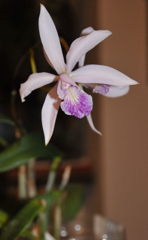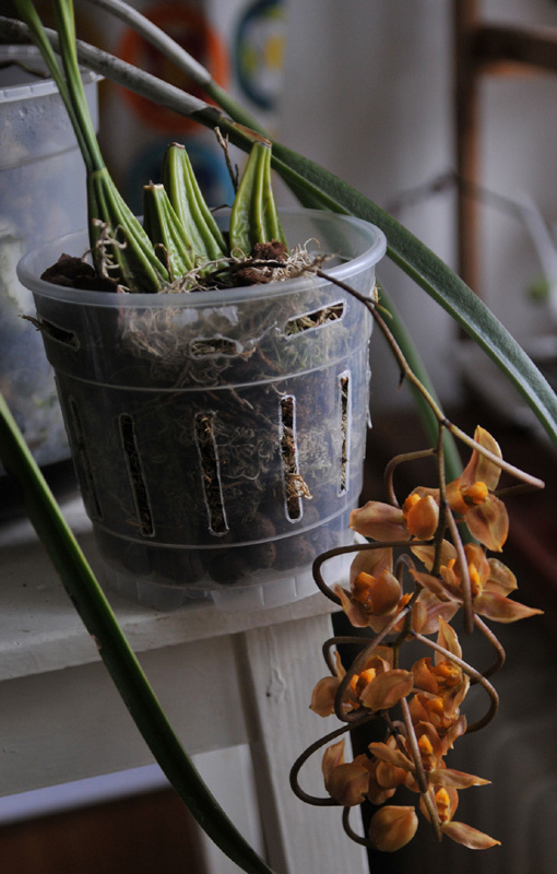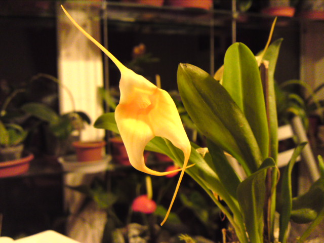 Vykvetla mi galeata. Získal jsem v létě oddělek z větší rostliny a květní stvol se vyklubal z tohoto oddělku. Rostlina začala vyhánět další květní stvol, tak jsem ho ustřihl, protože má přece jen 4 pahlízy, tak aby se rostlina příliš nevysílila. Raději bych byl za novou pahlízu, než desítky květních stvolů z rozdělené rostliny.  Koupil jsem předevčírem na orchidejářské schůzi tohoto křížence dvou rupicol laelia caulescens x laelia lundii (jsem překvapen, že dvě miniaturní laelie vytvoří tak velkou kytku - listy přes 15cm, výška rostliny cca 25cm... Majitel říkal, že jde o dělenou rostlinu a byl překvapen, že mu stejnou sezónu po oddělení rostlina vykvetla z těchto oddělených pahlíz. Jde vlastně o dva příklady, které odporují tvrzení v knihách, že po oddělení rostlina minimálně další rok nepokvete.