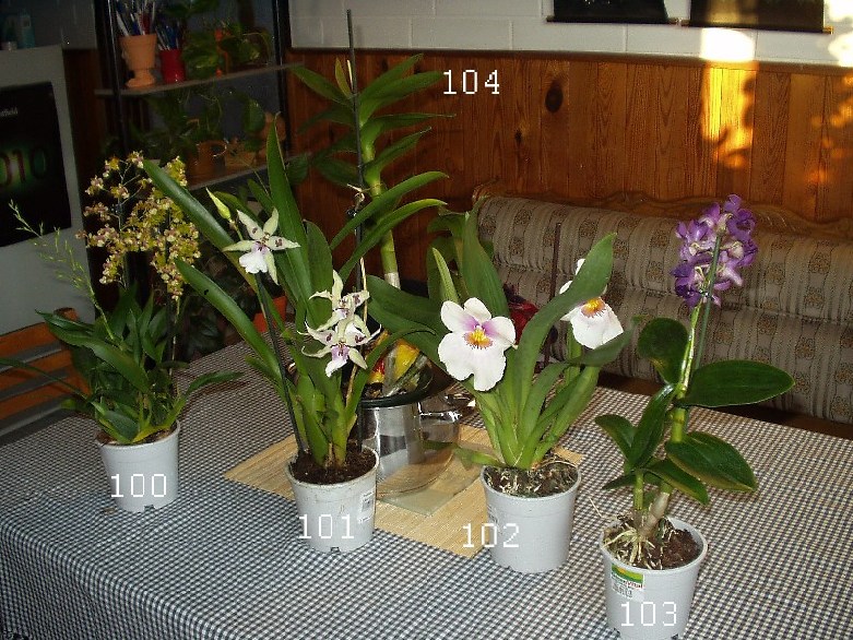 josef1josef píše: Zdravím všechny v předvánočním shonu.Ježíšek  mi nadělil už v neděli odpoledne dárečky, ale potratil někde jmenovky. Asi jak chvátal z toho obchodního řetězce, nechtěl se nechat ušlapat davem zaslepeným slevami. Limitovaná velikost snímku bohužel nedovoluje lepší zobrazení, ale mohl bych je nafotit po jedné, pokud toto nebude stačit. Pomůžete? Určitě stačí jen rody. Děkuji a přeji hezké a klidné Vánoce. Josef1josef 103 + 104 Dendrobium 102 Miltonia 101 Beallara 100 Odontocidium Pupukea Sunset (tipuju, bylo by to jistější podle detailné fotky)