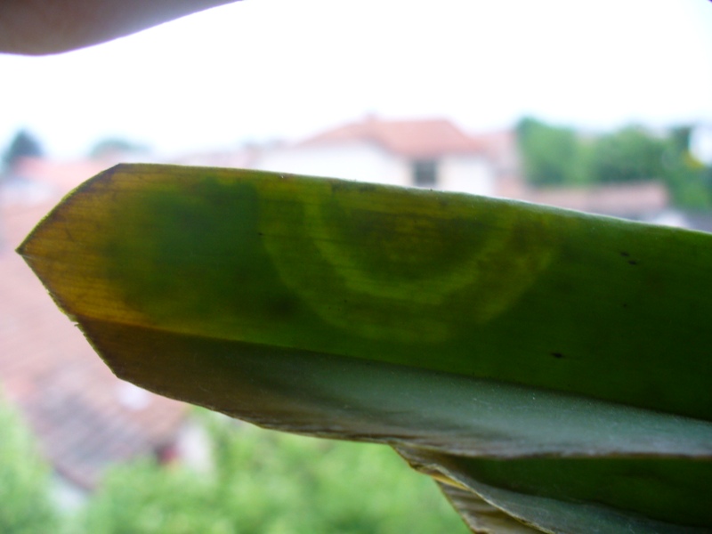 A nemůže to být od zimy nějaký přemrzlák?Psal,že mu odešlo na chvíli ve skleníku topení..Nevím,jen se mi zdá,že by to mohlo být od mrazu...Ono od slunka to udělá puchýřek,tohle na slunko nevypadá.Tak a ted dostanem spucunk,tohle patří do jiného tématu...