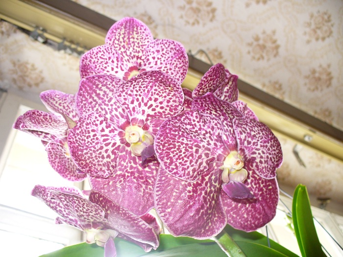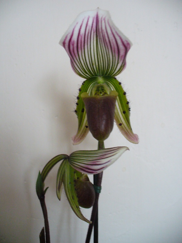 10vekikych kvetu a bohuzel ulomena 2 poupatka odshora-10cm na prvnim vyhon ua druhy je takova ta klasicka palicka nahore.Pan tvrdil,ze je to Vanda Red Magic-ale me cervene ma daleko-spis takova vinova.Ptala jsem se prodejce na rodice,jesli nema Vandu sanderianu a spot-a on ze ze proste je to V.Red magic.Meli tam jeste velikostne a kvalitove tutez jen tmave fialovou taky se dvema vyhony-po te jsem pasla ihned,ale vzala jsem si tuhle,protoze me pan ukecal,ze tahle ma druhy vyhon mensi a nez mi pokvete,tak mi odkvete ten druhy a vic si ji uziju.U jednoho stanku melu nadhernou site cervenou za 35 eur,ale koreny nic moc a nahore uz zadne poupe. U tehoz stanku jsem nechala i zbytek penez a koupila si tam strevic,ale nazev nema-mne to je jedno a vy to tady stejne nekdo budete vedet.Ma 2 kvety,strakate listy a 3 nove rostlinky. Oprotim jinym,treba velkokvetym, ji meli nejlevneji v porovnani s kvalitou a velikosti za malo.Strevicek me tsal 18 Eur.