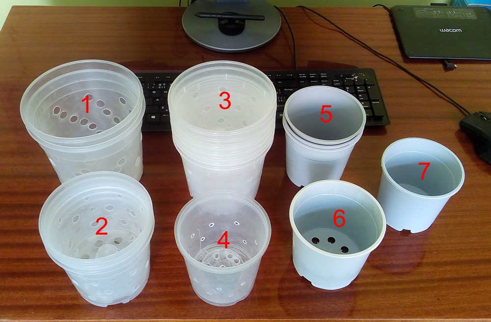 - transparentné kvetináče na orchideje, dierované, použité - dezinfikované savom. Cena za kus 5,- Kč Rozmery (podľa číslovania na fotke): 1 - priemer 16 cm, výška 14,5 cm - 2 ks 2 - P 13 cm, v 11,5 cm - 3 ks 3 - p 14 cm, v 12,5 cm - 7 ks 4 - p 11,5 cm, v 11 cm - 2 ks 5 - p 11,5 cm, v 10,5 cm - 3 ks 6 - p 12 cm, v 10 cm - 1 ks 7 - p 11 cm, v 9,5 cm - 1 ks