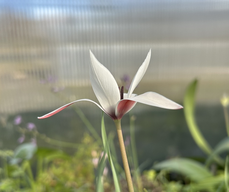 Nejmodřejší z modrých, Lapeirousia azurea, mě letos zase potěšila. Chtěl jsem ji sprašovat, ale hned vedle kvete podobná, jen světlejší L. corymbosa a dnes ve skleníku létala obrovská drvodělka a navštěvovala všechny květy, tak z toho nic nebude - bastardy se mi pěstovat nechce. Lapeirousie se u mne vegetativně skoro nemnoží, tak se příští rok budu muset o semena pokusit... Potom jeden botanický tulipán - Tulipa clusiana. Kromě téhle bílé formy mám ještě žlutou, ale ta letos nekvete. T.