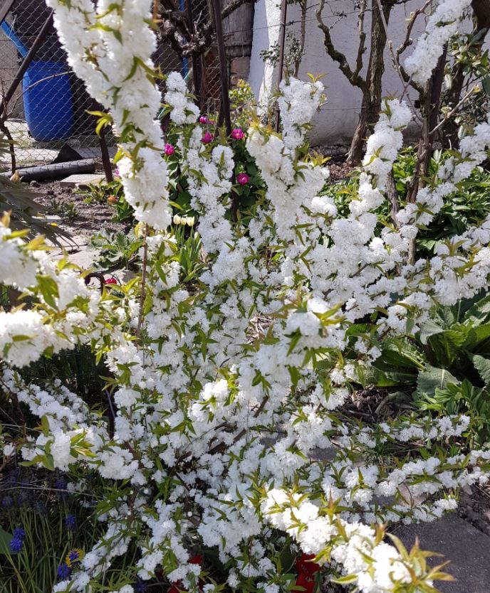 Višeň plstnatá, stáří 35 let. A "Vítací výbor". V plném květu, na rozdíl od meruňek
