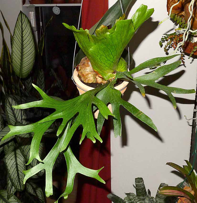 To P. grande mám menší a četl jsem že v bytě někdy začne dělat ty plodné listy až když ty sterilní dosáhnou 3/4m. To nevím kam bych ho dal, ale je to krásná kytka. P. grande když má člověk štěstí tak zůstane metrové a když smůlu tak dva metry vysoké  . Asi hodně záleží jak je krmené. To P. coronarium jsem nakonec přesadil zase do květníku ale keramického. Koupil jsem si hned dvě a jedno mám v obýváku také v květníku, ale těžkém keramickém aby se nezvrhlo. Oproti P. bifurcatum je takové neokoukané, jinak hezké. Pak mám ještě to P. bifurcatum které bylo původně v misce a koukni co se z něj stalo. Stříhám mu listy abych okolo prošel.