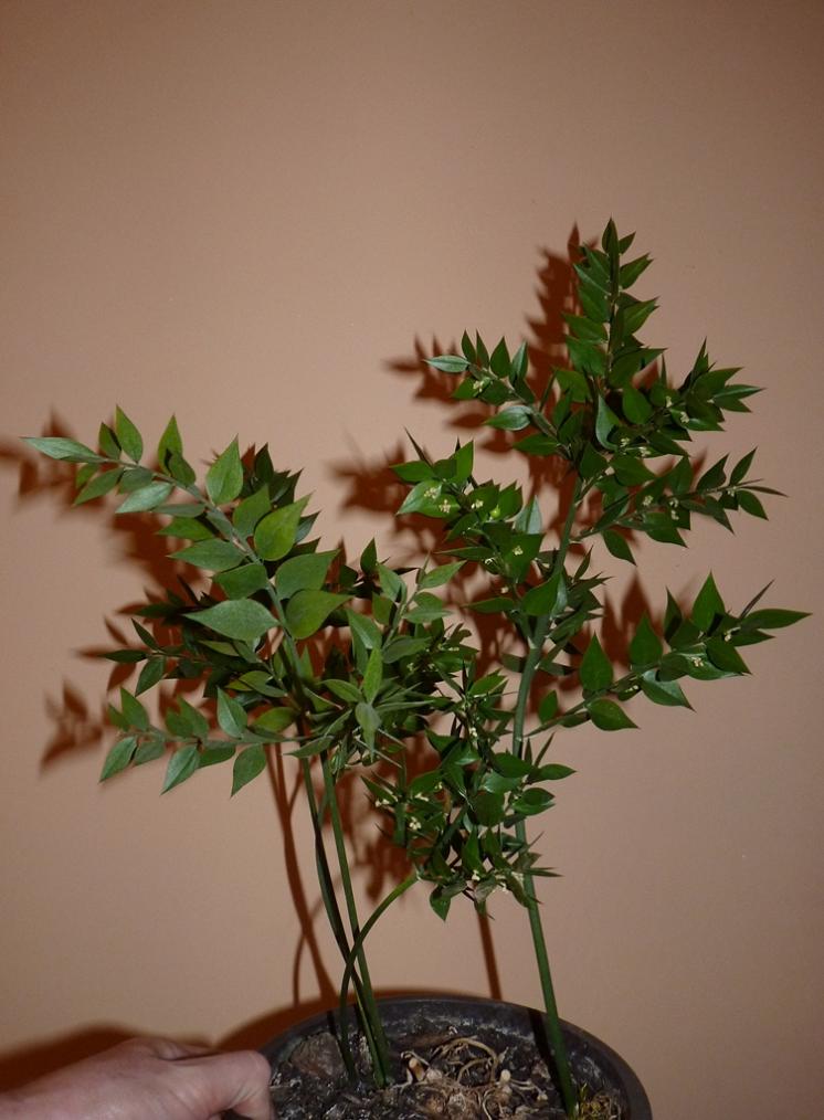 Rozkvetla tato zvláštní rostlina. Je to nějaký druh Ruscusu. Nejspíš Ruscus aculeatus. Jedno si o ní pamatuju, že to, co se zdá jako listy, jsou přeměněné zploštělé stonky (fylokladium) a samotné listy jsou zakrnělé v šupiny. Pěstuji ji už opravdu dlouho a snažím se ji držet zkrátka, ale taky to není nijak rychle rostoucí kytka.