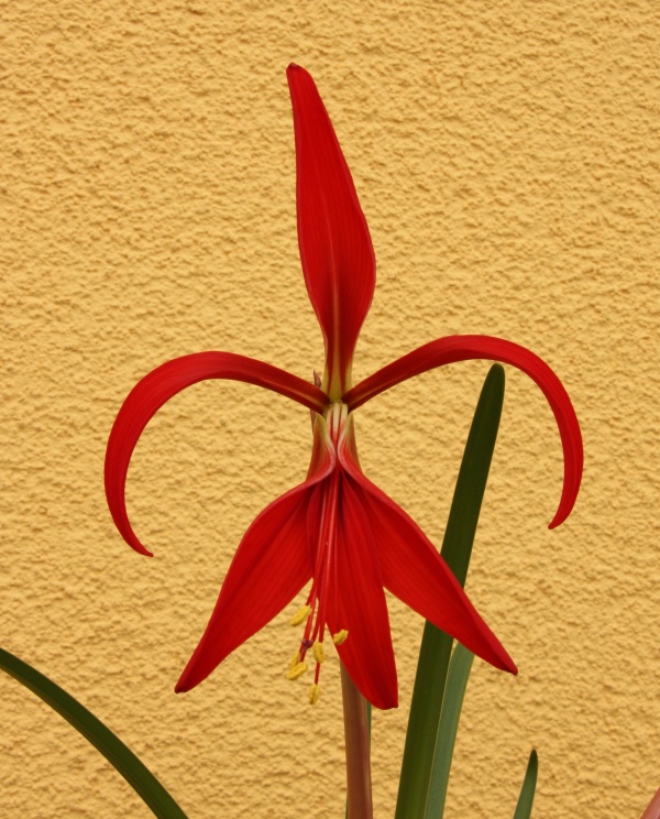Jardo, to Sauromatum je hezký. Kdysi jsem jedno měl, ale zklamal mne uzounký toulec, tak jsem nějak moc netrpěl, když jednou přemrzlo víc, než bylo schopno unést  . pafka, hvězdník je moc pěkný, ta barva sedí? U mne zimní sezóna pomalu končí, poslední, co kvete, je Ornithogallum dubium, ale to vyfotím až ve středu  . Dnes bych si dovolil otravovat s jednou "letní" kytkou. Sprekelia formosissima se vyskytuje v Mexiku (a asi i jinde ve Střední Americe) a je jednou z nejstarších exotických rostlin ve sbírkách - první cibule byly do Evropy údajně dovezeny v roce 1593! Patří do čeledi amarylkovitých (jako hvězdníky:-) ). Pěstuje se snadno v písčité zemině; některé příručky doporučují výsadbu na jaře na zahradu do skalky, ale já myslím, že tahle kytka na to není moc stavěná (nehledě na narcisovou mouchu), a tak se držím ordinérního květináče. Cibule se sází tak, aby byla celá pod zemí (na rozdíl od hvězdníků). Pro kvetení je snad důležité zimovat ji v teple - když jsem je nechal přes zimu ve skleníku při pěti stupních, moc se jim do kvetení nechtělo. Se zmíněnými hvězdníky se dá zkřížit: hybrid x Hippeastrelia si uchovává tvar květu po sprekelii, jen má trochu širší okvětní lístky. Kromě S. formosissima se ještě pěstuje druhý druh rodu, S. howardii, ale to je sakra vzácná kytka - pro spočítání pěkných fotek na netu by stačila ruka dlouholetého dělníka na pile  . T.