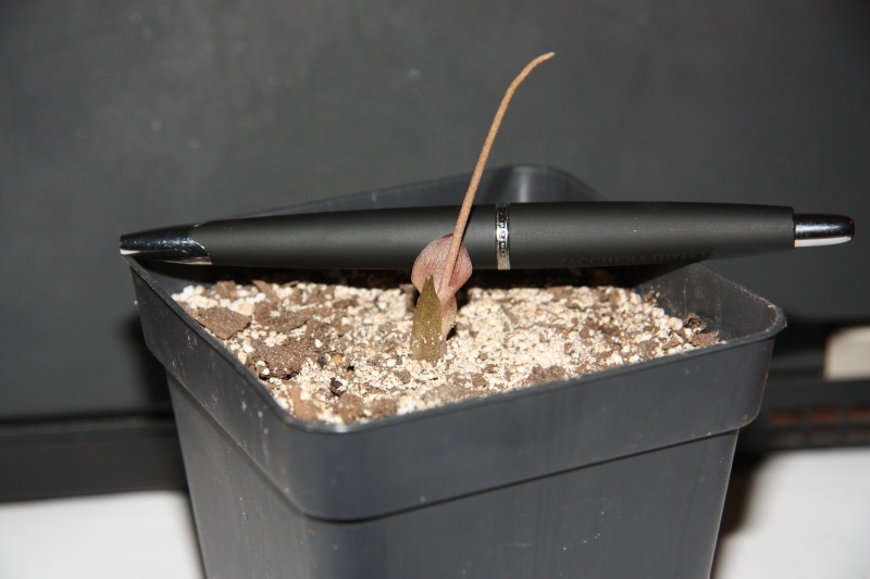 Tuhle hlízku mám půl roku, takže to není můj úspěch, ale stejně ji sem dám: rozkvetl mi Amorphophallus obscurus, drobounký východothajský zmijoveček. Teď jsem zvědav, jestli taky po odkvětu vyraší... Měla by to být forma s bohatě bíle stříkaným listem, poměrně málo k vidění (zpravidla mívá list zelený nebo namodralý). S malými zmijovci se teď roztrhl pytel, v posledních letech bylo popsáno nebo ještě na popis čeká dobře deset drobných kytek, v listu málokdy vyšších než 30 cm, které momentálně pronikají do kultury (A. terrestris, A. myosuroides, A. ongsakulii, A. verticillatus, nepopsaný A. pulchellus nom. prov. a další). Řekl bych, že běžně pěstovanému A. konjac (syn. A. rivierii) roste zdatná konkurence, podstatně skladnější a takřka nesmrdící  . T.
