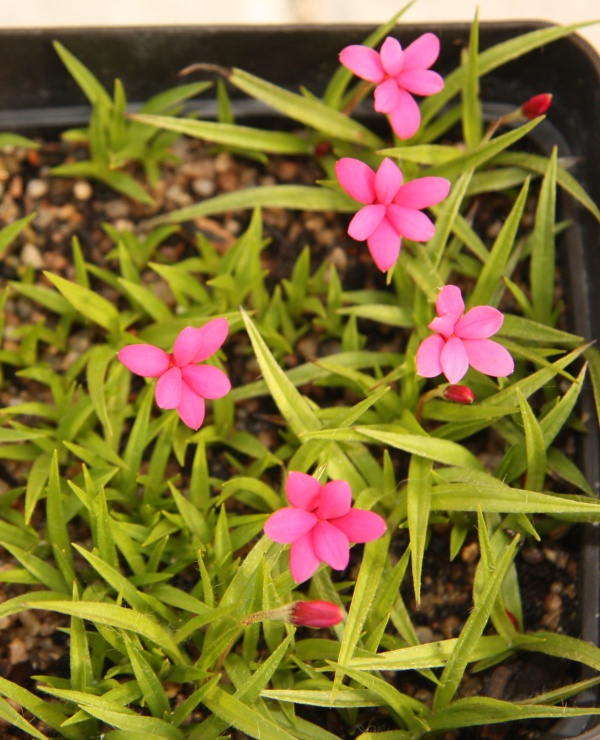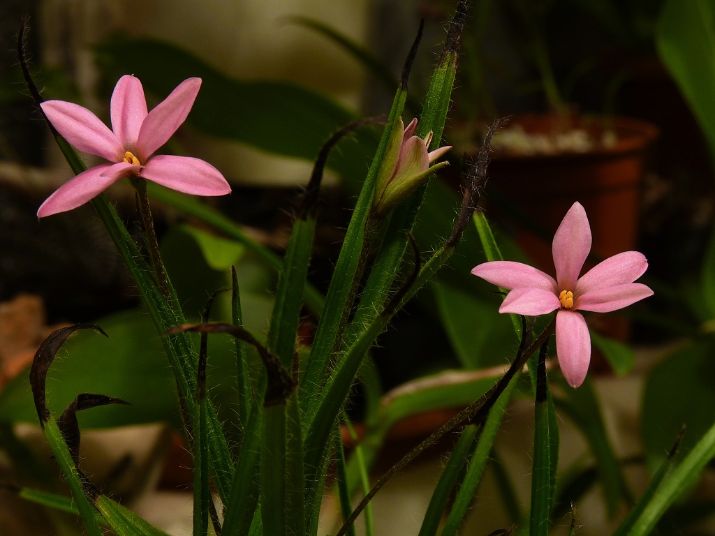 Tak už mi Tome taky začíná rozkvétat Rhodohypoxis, ale jaký druh nebo hybrid to je, netuším. Vždycky mi u něho takto zasychají konečky listů. Nijak mu to nevadí, ale vzhledné to taky moc není.