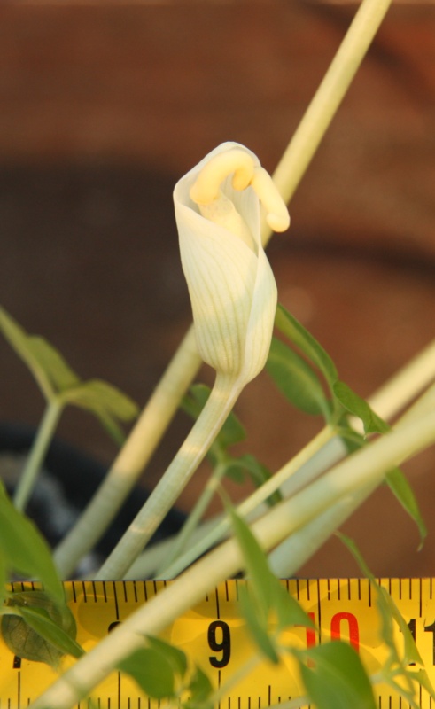 Sandersonia je perfektně zapěstovaná, nikdy jsem neměl tolik květů. Byla s gloriózami od dubna venku? Já se vždycky potýkám s tím, že mi tyhle kytky (gloriózy a litonie) doma strašně vytáhnou a pak kvetou někde u stropu; vyndat je hned na jaře ven jsem se vždycky bál. Asi to příští rok zkusím podle Vás, pane Raabe. Tady kvete jeden drobeček z Laosu (od pana Raaba  ) - ten zkroucený spadix je patologický, normálně je rovný. Velikost květenství a dospělých listů (na prostřední fotce) je vidět  - příjemná změna po těch už zmiňovaných "obrech". Rychle se množí drobnými dceřinnými hlízkami, dospělá hlíza je velká asi jako lískový oříšek nebo spíš menší. T.
