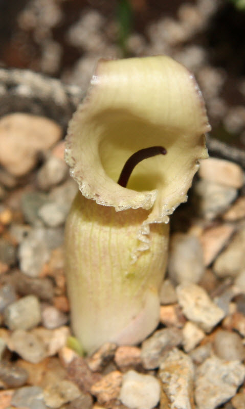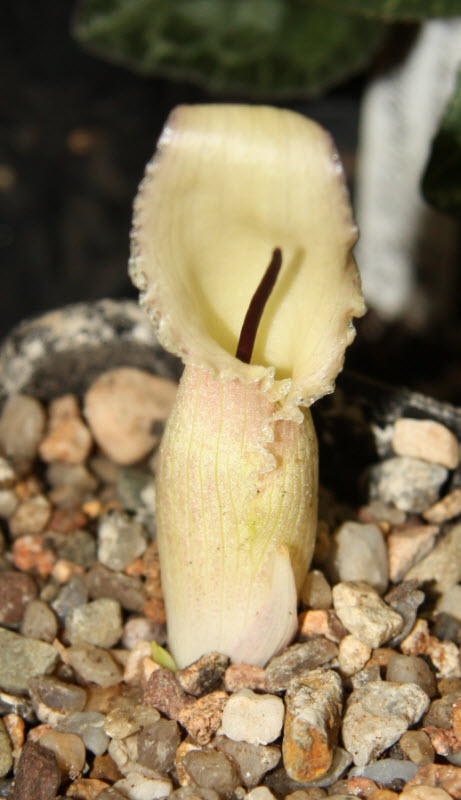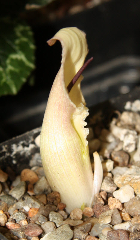 Biarum marmarisense se vyskytuje v jihozápadním Turecku a na řeckém ostrově Simi u tureckého pobřeží. Spolu s blízce příbuzným druhem B. davisii z Kréty (původně bylo popsáno jako jeho subspecie) a na rozdíl od ostatních asi dvaceti druhů má vonět (já nic necítil, ale čuchal jsem k němu jen jednou). Mělo by patřit k nejsnadněji pěstovatelným druhům rodu, tak uvidíme - mám ho dva měsíce, takže se tu vlastně chlubím cizím peřím  . Kromě něj mám ještě B. davisii, B. pyrami a B. tenuifolium ssp. zelebori - to poslední už tři roky a rok od roku je slabší... Všechna biara se vyskytují kolem Středozemního moře a nejdále jdou do Persie, mají tedy typicky mediteránní růstový cyklus - v létě klid v teple, v zimě vegetace. Většina druhů kvete na podzim, jen některé až na jaře. Jsou to drobné až středně velké kytky - hlíza má tak do 5 cm v průměru, listy do 20 cm, květenství na obrázku je asi 7 cm vysoké, ale u jiných druhů může mít taky těch 20 cm. T.