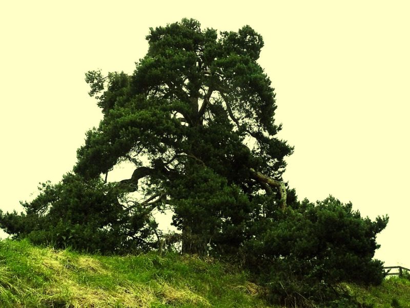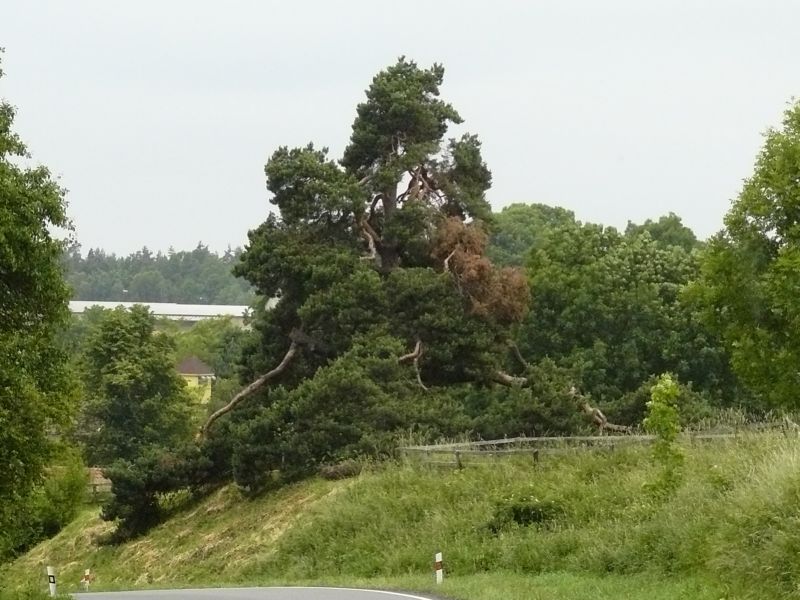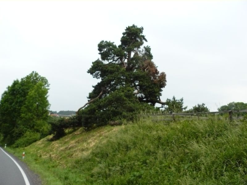 Jedna z krásných inspirací pro předlohu na bonsai. Velmi stará borovice, ke které se váže pověst, že rytíř vracející se z křížové cesty byl křivě obviněn z hrdelního zločinu. On se modlil k bohu a před soudem si přál poslední přání, které dokáže jeho nevinu. Vzal sazenici borovice, kterou vypěstoval ze semene, které vezl ze svaté země a vsadil ji korunou do země a kořeny nahoru řka, že pokud je nevinný, borovice poroste i tak. Protože borovice byť obrácená začala obrážet byl osvobozen a tak si zachránil život. Bohužel jsem ji nenafotil před dvěma lety, kdy ještě nádherná větev byla až k silnici. Vítr však udělal své a zlomil ji, proto byla zkrácena a je tam vidět pahýl. Jde o památný a chráněný strom.