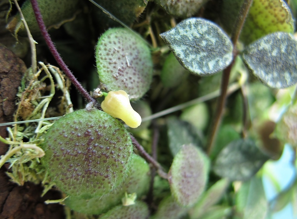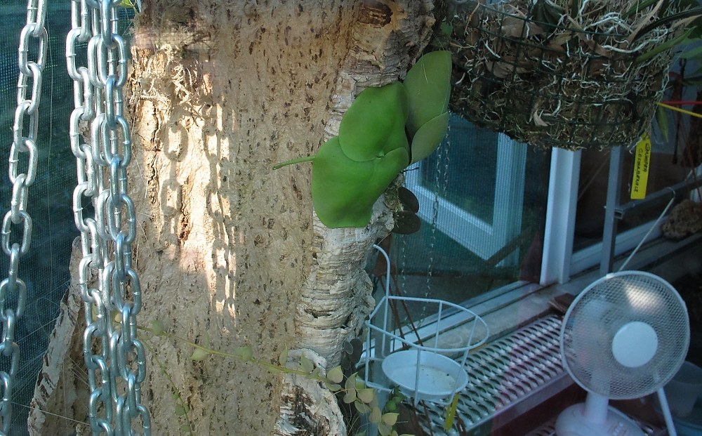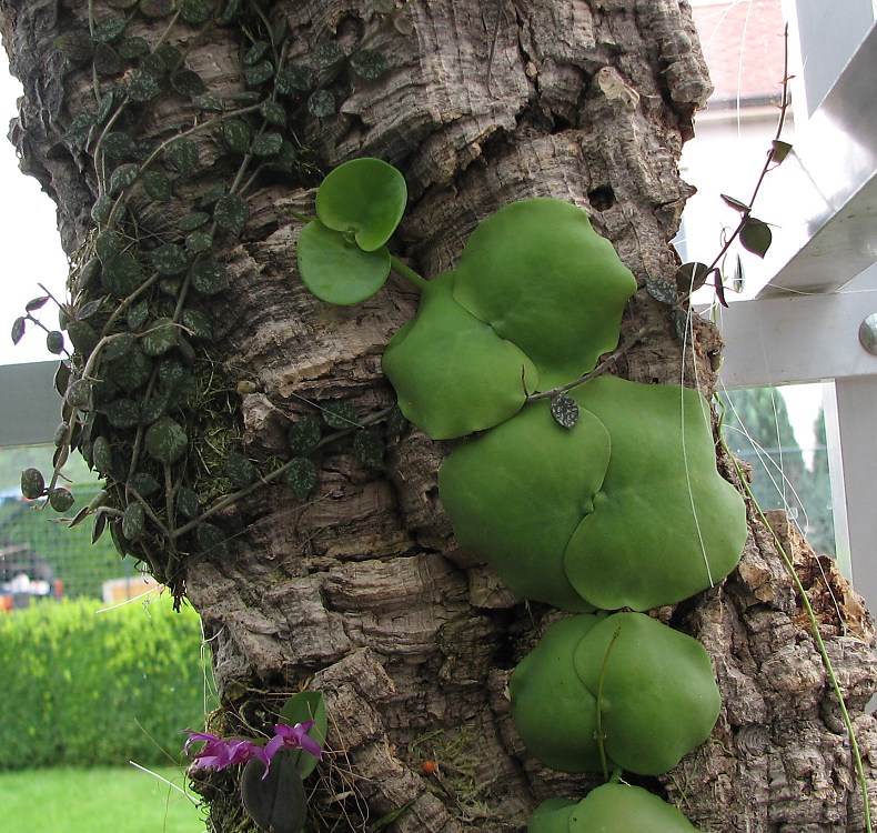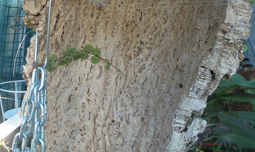Když už jsem v tom focení tak ještě něco .Dischidia imbricata udělala sama takový jakoby obchvat(nechávám ji ať si dělá co chce) a řítí se na druhou stranu korkovníku přímo za sklo-no nevím a Dischidie hirta se přidává .Třeba to tam bude lepší a nebo třeba ne