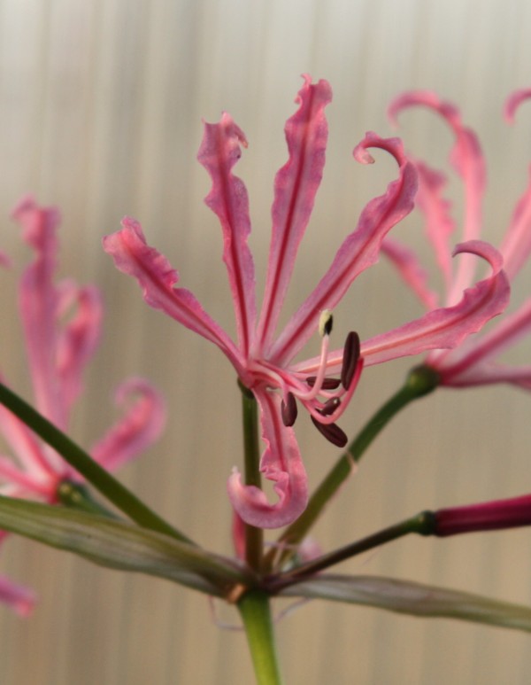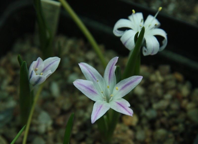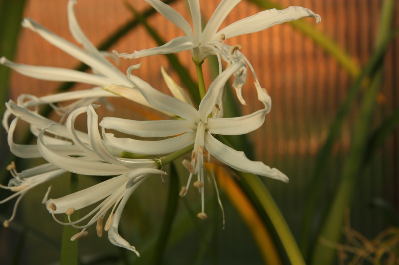 Podzim zdárně pokračuje, za poslední dva týdny se zase ve skleníku něco pohnulo. Z jihoafrických rozkvetla Nerine bowdenii - tahle kytka se v normální růžovofialové formě občas objevuje jako řezaná v květinářství, tady představuji bílou formu. Mimochodem, někdy se z toho řezaného květenství i ve váze podaří dopěstovat semena; nerine jsou samosprašné (většinou) a semeníky zrají neskutečně rychle: v okamžiku, kdy dokvétají poslední květy, je možné vysévat semena z těch nejdříve odkvetlých! Semena jsou masitá a nesnesou skladování, pokud s výsevem počkáte tři týdny, už asi nic nevyklíčí. Na druhé fotce je Nerine pudica; zatímco ta první kvetením svou sezónu končí, tahle kvetením naopak startuje do růstu. Patří totiž do skupiny čtyř "zimních" druhů v jinak "letním" rodu. Na třetím snímku je drobná Polyxena longituba z čeledi hyacintovitých. Květy mají asi centimetr a půl a velmi pěkně voní. Zpátky do Evropy: Crocus cartwrightianus ze skupiny podzimních krokusů a ještě jednou bílé C. hederifolium, které se docela rozjelo.