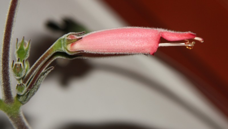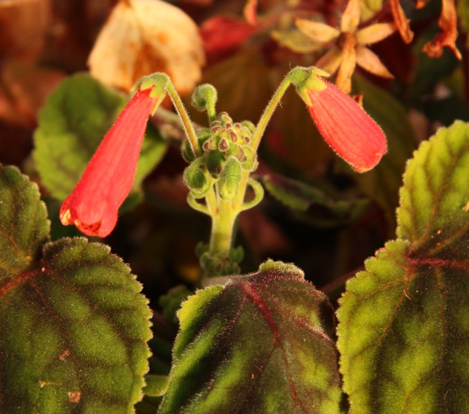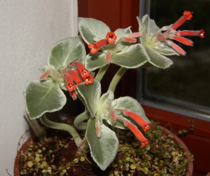 Teď jeden žánrový pohled do skleníku (C. hederifolium dokvétají a začínají být plně olistěné) a pak na skok do tropické Ameriky. Smithiantha patří do čeledi podpětovitých stejně jako třeba africké fialky nebo honzíky (že, Karlosi  - ještě je pěstujete?). Pod zemí má housenkovité rhizomy tvořené stonkem se zkrácenými internodii, pokrytým ztluštělými přeměněnými listy - tímto orgánem vytrvává přes zimní období klidu. Na jaře pak raší z těchto rhizomů, případně je prý možné sdrhnout ztloustlé lístky ze stonku, rozhodit je po povrchu zeminy a překrýt tenounkou vrstvou substrátu; každý lístek vytvoří kompletní rostlinku (stejně se lístky množí fialky, takže logiku to má). U mne smitianty kvetou takhle pozdě na podzim a na jaře se pak pozdě budí; ač tropické, rostou mi líp ve skleníku s nočním poklesem teplot než doma ve vyrovnaných teplotách. Na ilustračním fotu rhizom blízce příbuzné kolerie. T.