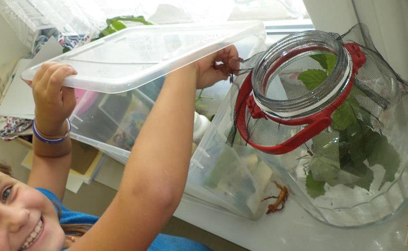 Děcka si je berou na ruku, pozorují při jídle, svlékání a kladení vajec...s mou pomocí jim čistí domeček, doplňují maliník...