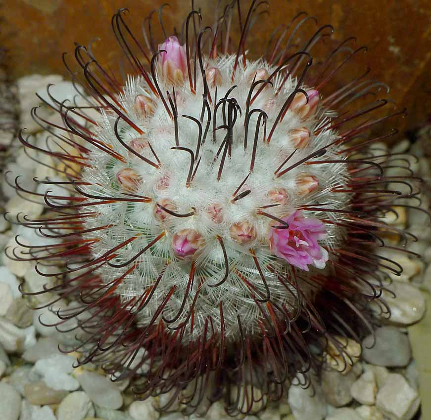 Mamillaria senilis, klasický a žlutě kvetoucí forma. Dříve obrovská vzácnost kterou nikdo neudržel dlouhodobě ve sbírce, dnes se její kultivace daří i jako pravokořenná. Pochází z Mex. nadm. výšky až 3500m, kde je v zimě až -10°C a téměř metr sněhu!