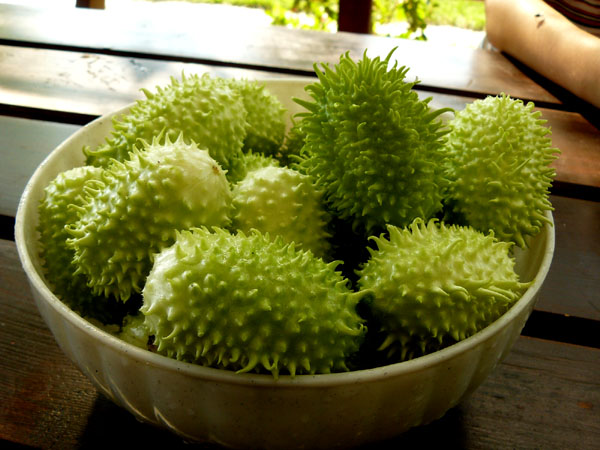 Tak první úroda mexického Maxixe. Vypadá výhružně ale trny jsou měkké, takže se to jí celé. Chuť velice jemné okurky a nenastává po nich těžkost žaludku a krkání jako po okurkách, takže to bude i vhodné pro lidi, kteří mají okurky rádi ale dělají jim těžko. Velikost je jako slepičí vejce. Určitě to bude vypadat krásně i naložené. Zkusím to. Velice rozložitá rostlina habitem podobná melounu jen s malými listy. Uvidím, zda je odolná proti plísni okurkové. Pak by to bylo perfektní. V Mexiku z toho dělají i jídla podobná leču ale ostrá.