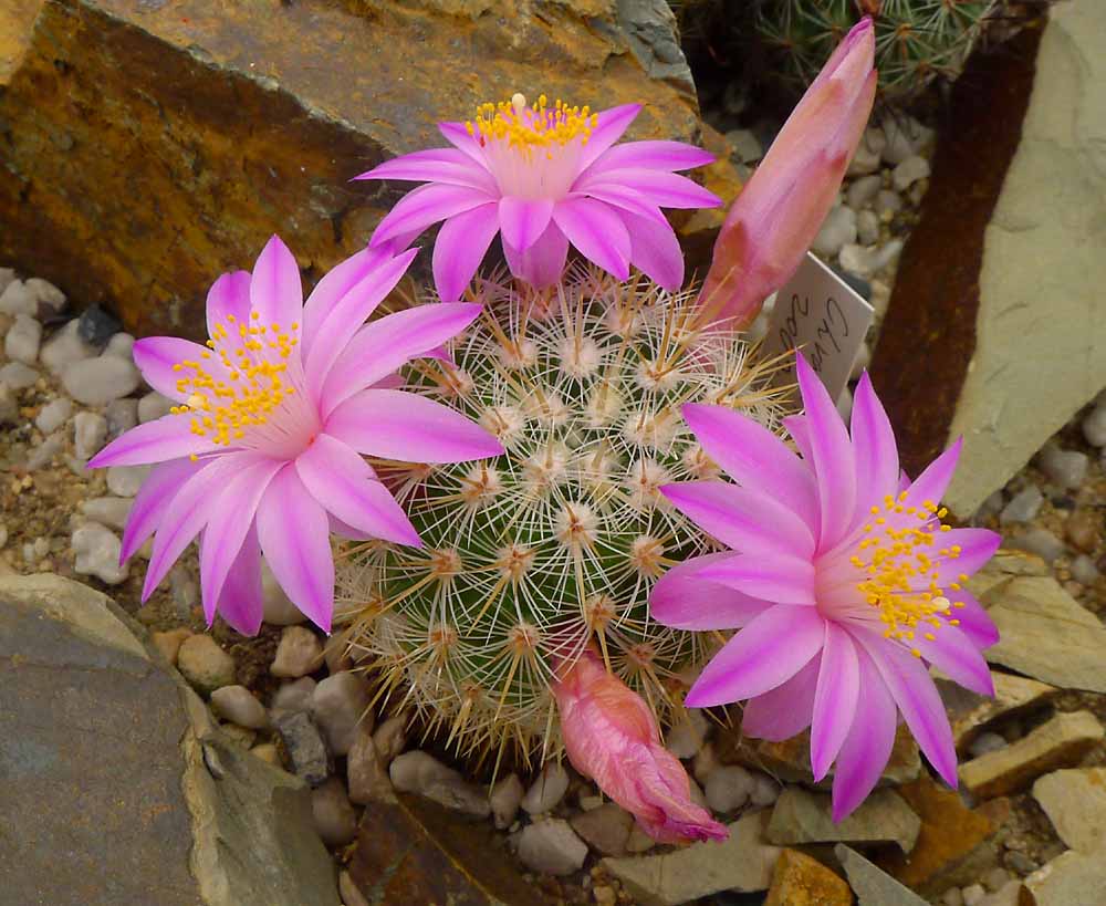 Dva zajímavé druhy rodu Mammillaria. Na horním snímku je nedávno objevená M. bertholdii a jak to vypadá s její kulturou problémy ve sbírkách nebudou. I pravokořenné rostliny kvetou jako "besné" Dole je M. scheinwariana jejíž lokalita v přírodě byla před lety zatopena přehradou Zimapan. Dlouhé roky se myslelo, že taxon je vyhubený v přírodě. Až před několika roky byla znovuobjevena Česko-Polskou výpravou na jednom břehu na skalách. Postupně se rozšiřuje i do sbírek. PS: Na květech na obrázku dole je vidět nějaký roztoč. Od té doby co ho mám ve sbírce tak se na rostlinách neobjevují svilušky. Zajímavé je, že mu nevadí ani zálivka Confidorem. Myslím, že je to užitečný brouček  . Ve vlhku orchidejového skleníku by se mu asi nelíbilo. Ve sbírce jich mám určitě přes 1000ks