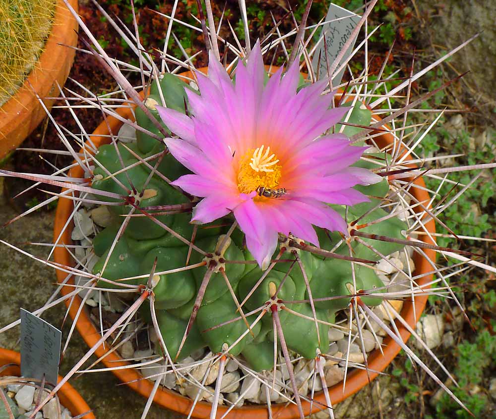 Zdenka píše: Nevím, jestli to bude k rozpoznání. Trny jsou čtyři, rozložené jako na ciferníku hodin - 3,6,9,12. Čtyři trny jsou středové- ty vidím zřetelně, ale připadá mi, že na každé areole je ještě několik malých sklovitě bílých trnů okrajových. Pak by šlo o jednu z mnoha forem Mammillaria rhodantha, tato je velmi podobná jedné mé rostlině ze státu Zacatecas, Mex. Pokud tam okrajové trny nejsou tak to bude M. polythele ze státu Hidalgo, Mexiko.