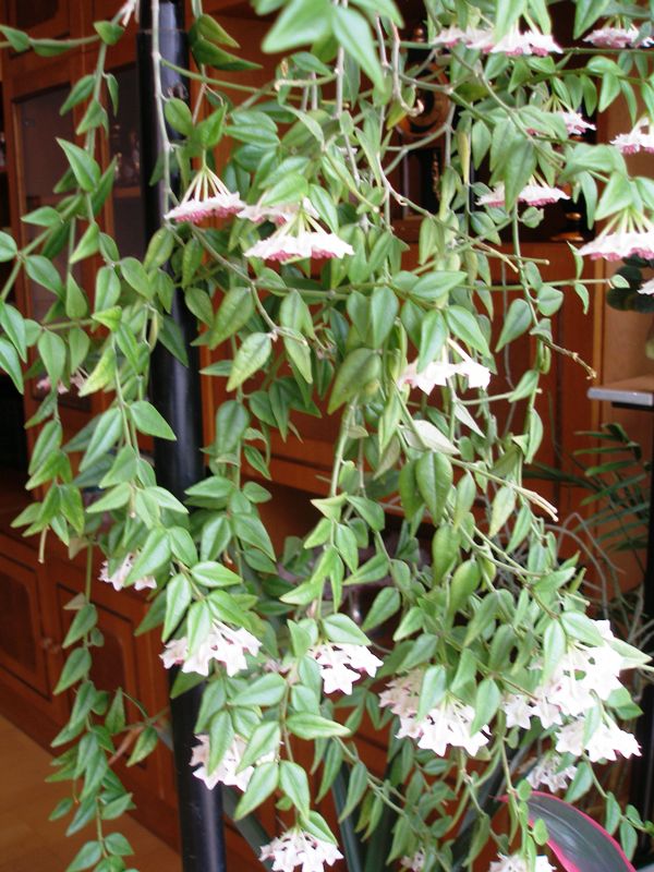 Rozkvétá Hoya longifolia od Tommyho. Nasadila spoustu květenství, ale asi nevykvetou všechna. Tommy díky