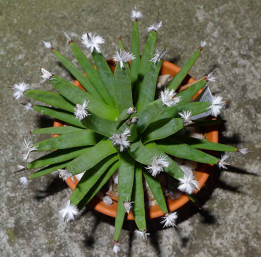 Agave albopilosa- nádherná hříčka přírody. Trny obalené jemnými chloupky které se postupně působením klimatických jevů rozevírají v otevřené zářivě bílé chomáče- to může vymyslet pouze příroda. Na lokalitě mají jakousi funkci kondenzátorů mlhy k vylepšení vodní bilance rostliny. Zřejmě si dospělé rostliny uchovají tuto vlastnost i v kultuře.