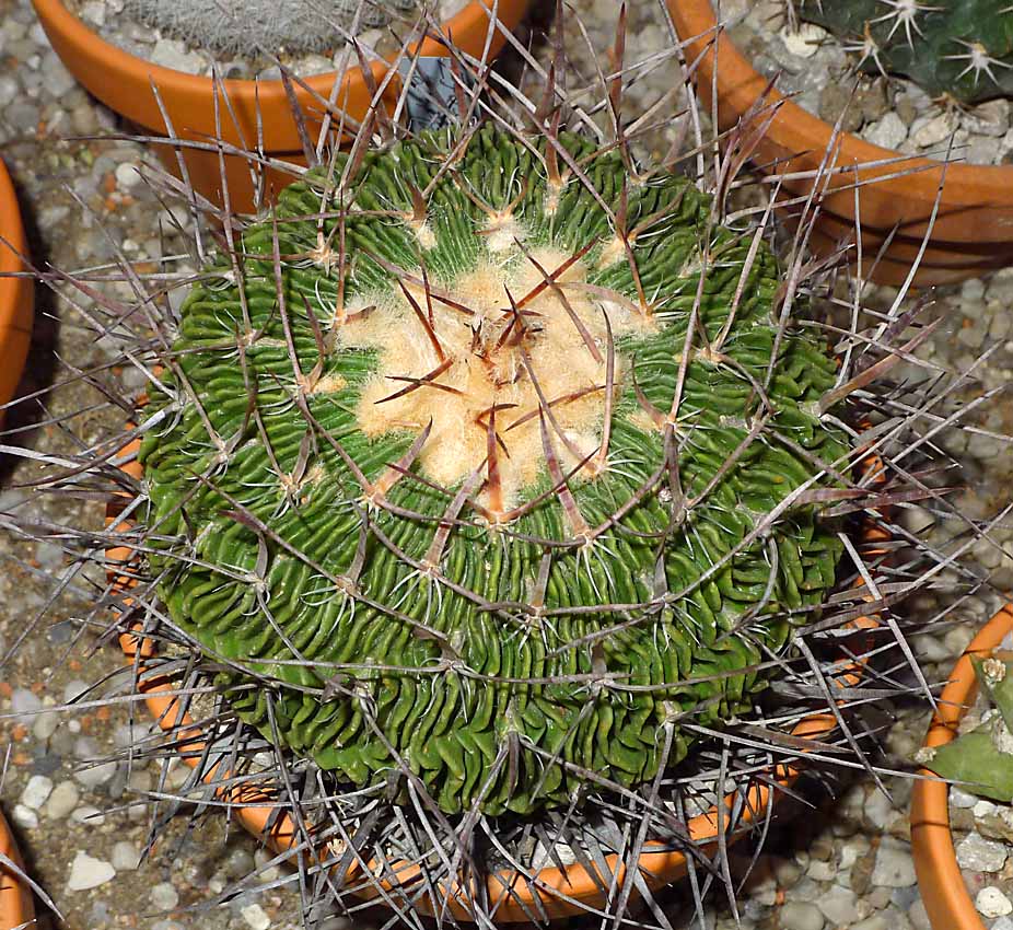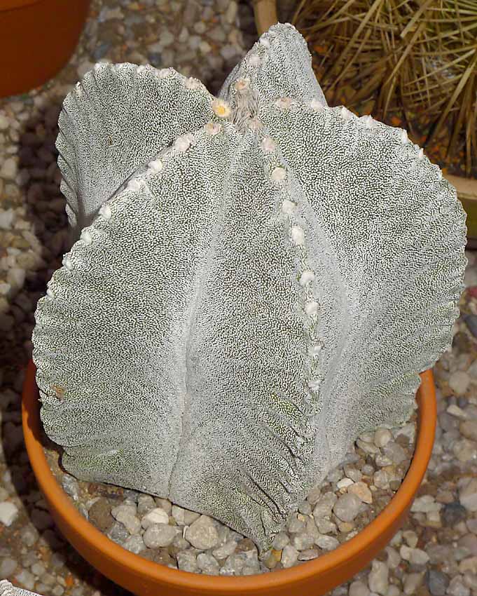 Další dva zajímavé kaktusy. Astrophytum myriostigma nazývaná dříve též Biskupská čepička a Echinofossulocactus multicostatus La Muralla - asi import. Původnímu majiteli rostlina nikdy nekvetla protože zimoval ve sklepě ve tmě. Echinofos. zimované ve tmě většinou nekvetou. Já mám vytápěný skleník, tak snad se příští rok dočkám. Květy má karmínové. Rostlina má 120 žeber. Rekord je cca 160!