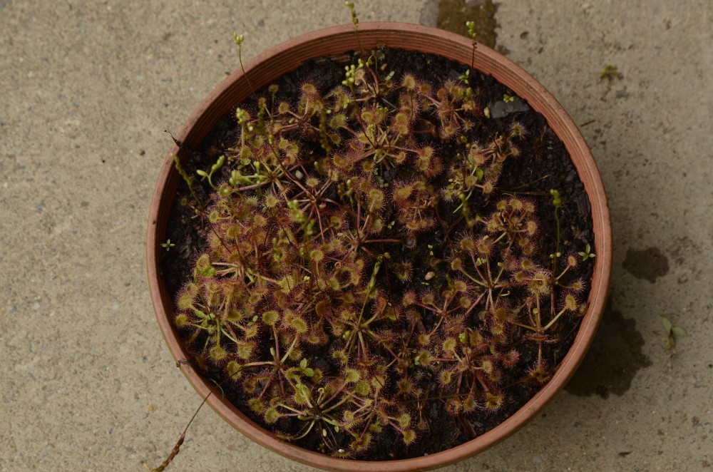 Obyčejná rosnatka ohrouhlolistá, které stačí čistá rašelina a miska s vodou po celý rok! Občas je nutné přesadit.