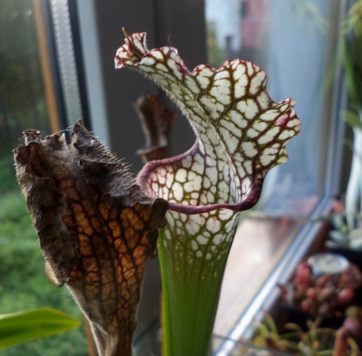 Cephalotus - zhoršující se světelné podmínky - starší pastičky z léta vypadají ještě pěkně.... nové vyrůstají už jen slabé...zelenější a začíná tvořit listy...